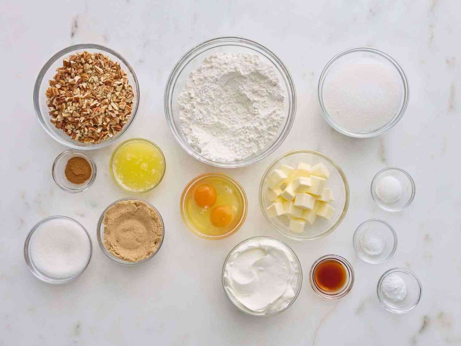 - Step 3:Make the topping: Mix pecans, white sugar, brown sugar, melted butter, cinnamon, and salt together in a mixing bowl until thoroughly combined and all components are coated with butter, 3 to 4 minutes. Dotdash Meredith Food Studios