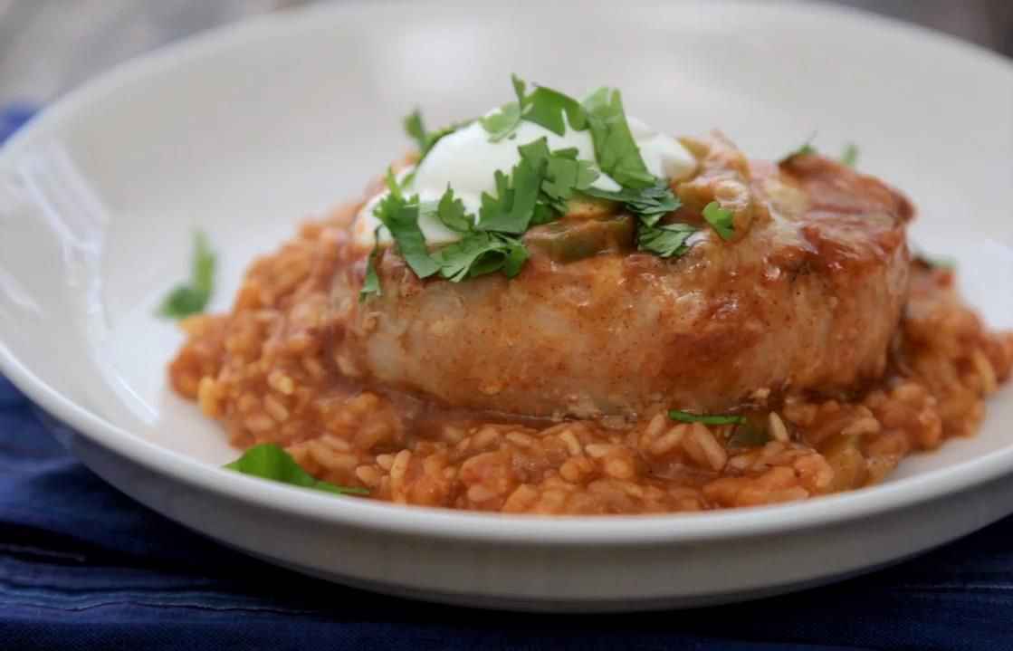 Easy and delicious. Tender pork chops in the best Mexican rice. A perfect weeknight meal.