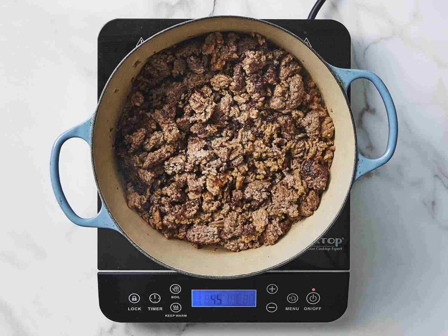 - Step 2:Heat a large stock pot over medium-high heat. Crumble ground chuck and sausage into the hot pan. Cook, stirring frequently, until meat is evenly browned. Drain off excess grease. Dotdash Meredith Food Studios